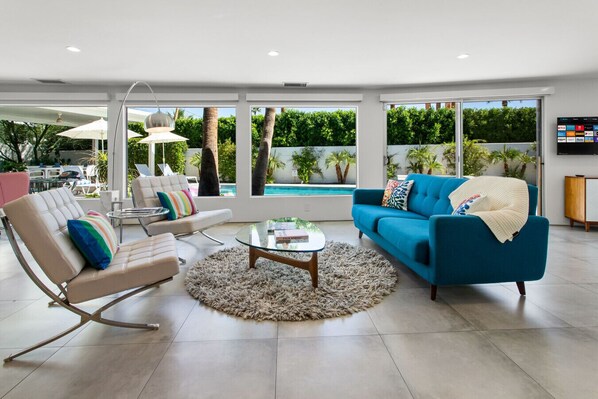 Once featured on the Modernism Week property tour, the home has been remodeled with mid century modern furnishings & fixtures, along with updated appliances and many features that make your stay comfortable and convenient. With two bright and airy living rooms that offer tons of seating options, a working fireplace, dining room and full bar area, our stunning property features plenty of room for your group to relax and unwind in.
