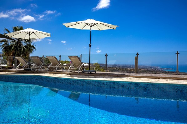 We stayed here for 2 weeks in Sept 2024 and it was absolutely perfect. The villa is well kitted out with everything you need for a comfortable stay. It was immaculately clean on arrival. The pool terrace is where we spent most of our time - it's simply stunning! The view is amazing. You have a choice of where to sit out there and there is plenty of shade if you need out of the sun. We would love to return here again in future. It's about a 15-20 minute walk into the top of the main road running through Peyia where there are a few bars and restaurants. It's in a very quiet location - if you're looking for peace and quiet and a relaxing holiday then this is the place for you.