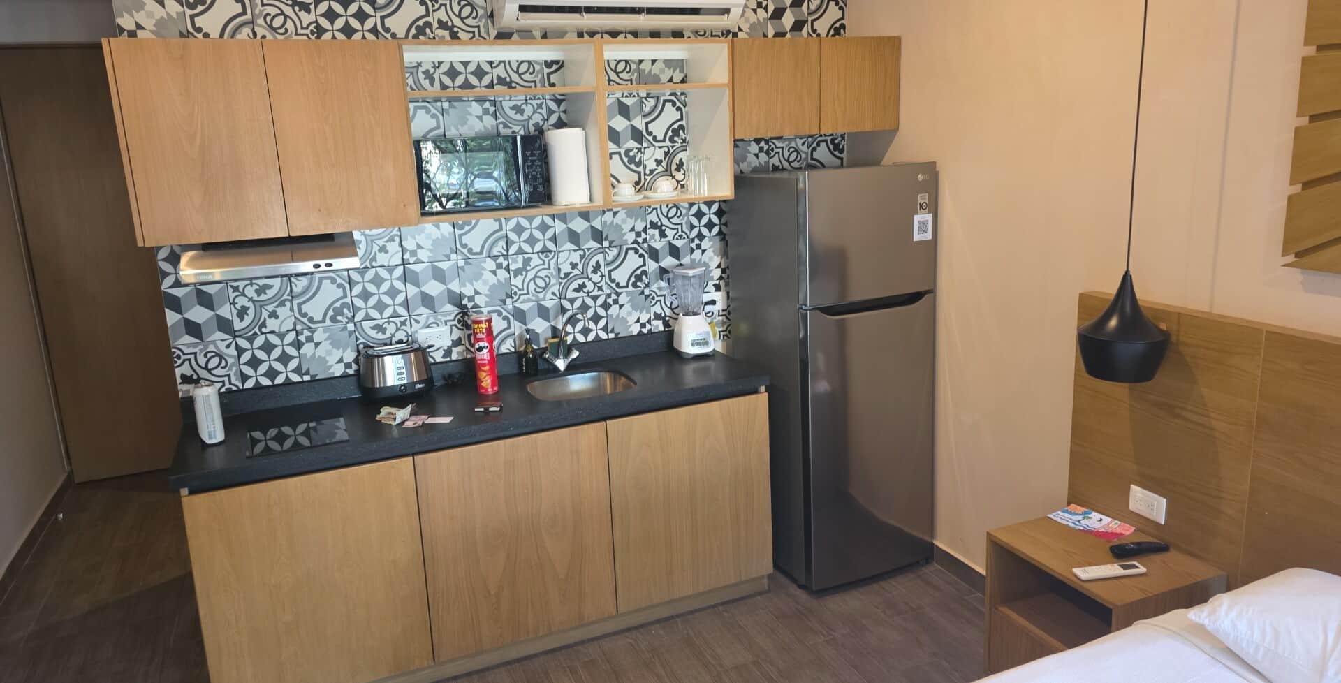 デラックス ロフト | 専用キッチン | 大型冷蔵庫、電子レンジ、ミキサー、調理器具と食器