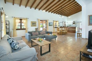 Villa Romeu, is a fantastic three bedroom villa. This beautiful villa has a large private pool, a magnificent outdoor area with beautiful gardens full of trees and plants and incredible mountain views. In this way, Chalet Romeu combines the tranquility of a charming rural setting and just a few minutes walk from the old town of Pollensa. Villa Romeu has free WiFi included.The outside space of Villa Romeu is perfect for enjoying a swim or sunbathing. The tables and chairs are shaded from the sun with the covered terrace and the beside BBQ area invites to relax or or dinner “al fresco", with fantastic mountain views. The traditional Spanish living area leads to the fully equipped kitchen, in American style. Two comfortable seating areas with table and chairs are perfect to enjoy dinner or lunch in spring or autumn.Villa Romeu has three comfortable bedrooms, each continuing the Mallorca theme with high beamed ceilings. Both twin bedrooms share a bathroom, meanwhile, the double bedroom offers an en suite bathroom with a bath/ shower. All bedrooms include hot / cold air conditioning. To enhance your comfort, they are available to be used at any time during the day and night.In an excellent location, just 10 minutes walk from the old town of Pollensa, they make Chalet Romeu an ideal option to enjoy a relaxing break.In Pollença you’ll find shopping a cultural center, the Pollença market, restaurants, cafes and bars. Traditional shops and churches are also present on this historic town. Enjoy the environment in the evening and take part of its activities. On Sundays there is a local farmers market in the main square where local vegetables, fruits and spices are abundant.Puerto Pollensa beach is perfect for relaxing at the Sun, or for the more active, enjoy water sports like kayaking, windsurf or jet skiing. In Cala Sant Vicenç (or simply Cala as it is known by the locals) there is a mini market, several small restaurants offering a variety of dining experiences and even a couple of bars. There are four small coves and two main areas of the beach. Cala Sant Vicenç has spectacular views and crystal clear waters.* * * * *Cleaning service, pool towels and a welcome basket is provided for free with every reservation. Tourist tax is included in the price online.For every confirmed booking, a guide with information about the local area and recommendations are provided, so that you can get the very best from your holiday.If you have any question or require assistance, we are always attentive and willing to help you.This villa can welcome babies. It has two baby cots and two high chairs available at no extra cost. Extra ones can be placed on demand.Our calendar is always 100% updated, so if your wished dates are free, be welcome to Book!