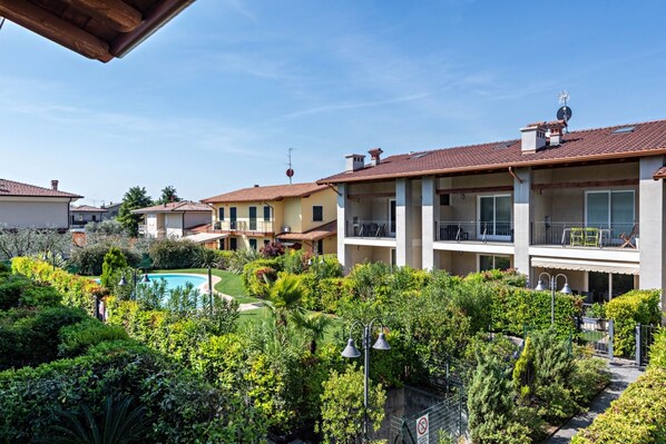 The holiday apartment boasts a private outdoor area with a covered terrace, a balcony, and a barbecue. The property has access to a shared outdoor area which includes a pool and a garden.