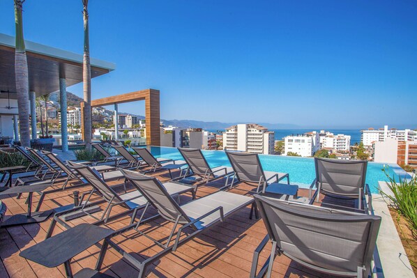 • Loungers, shaded seating, and panoramic city views