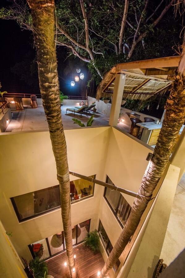 1,136平方フィートのスカイデッキには、2つの巨大なヤシの木があり、下のアトリウムからデッキを上向きに伸びています。 巨大なイゲラの木は、デッキエリアに緑豊かな天蓋を提供します。