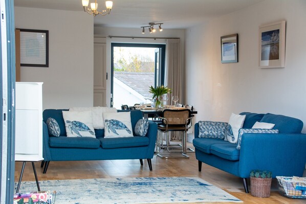 Full of light through the bifold doors, the living space opens onto the garden. The dining area is next to the kitchen and the whole layout is designed for sociable interaction. There is a smart TV and electric fireplace.