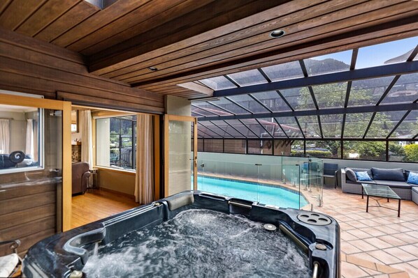 pool is not heated, and will be empty for the winter. In winter, the indoor area traps the sun to heat the house during the day. At night you can sit around the fire in one living room, and have the TV going in the other living room.