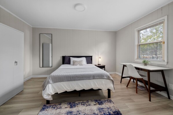 The bedroom features a comfortable queen bed designed to provide you with the perfect resting experience. Besides the hotel-like comfort, the bedroom is furnished to meet all of your needs.