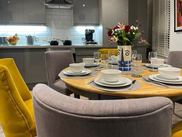 The Kitchen/Diner and Living room is located on the 1st floor of the house and has everything you need for your stay. There is an induction hob and oven, fridge freezer, dishwasher, microwave, washing machine and coffee machine which is all free to use for our guests. The kitchen is fully equipped and has everything you need for a self-catering stay.