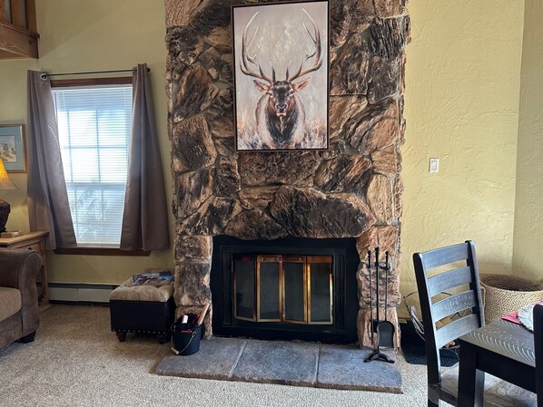 The main living area and full-sized kitchen are located on the 3rd level where you can warm up to the wood burning fireplace. There is a flat-screen smart Tv for your entertainment. By the dining area, a patio door opens to a private balcony with beautiful views of the mountains! On this level, there is a bathroom with a shower, as well.