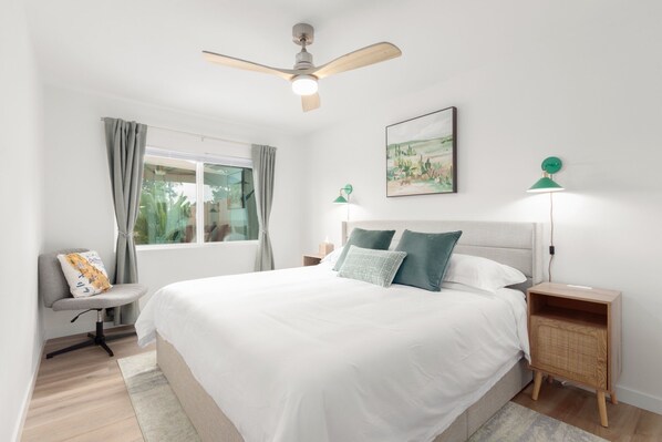 -There is a split system (A/C + heat) in the living room which serves the unit. The bedrooms do not have an A/C unit but have adjustable ceiling fans and a portable fan is provided. Extra blankets are provided as well.