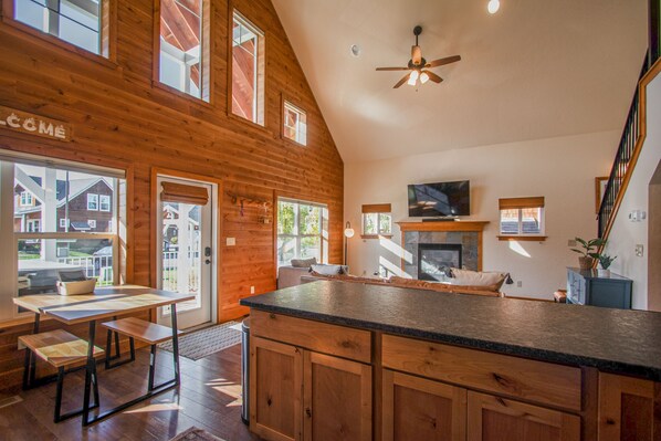 Start with your covered and furnished front porch where you can fire up the gas grill to add a little spice to your home-cooked menu, kick back and watch the world go by with cup of coffee or evening cocktail or enjoy a soothing soak in your private hot tub. Inside, this home features a great room comprised of a well-equipped, full kitchen with a breakfast bar, an intimate table for two, and a living area with a soaring ceiling, gas fireplace, and a TV for streaming all your favorite channels.