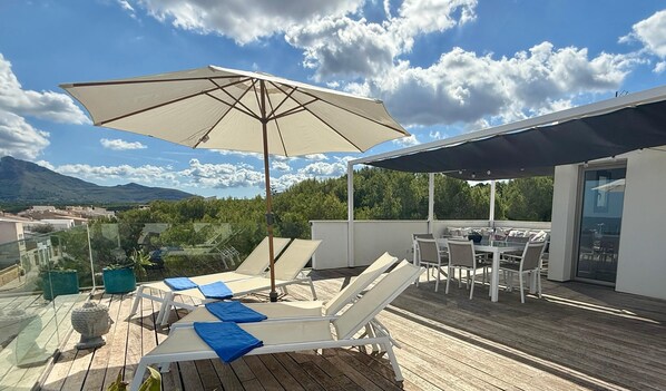 ラウンジとサンテラスから、素晴らしいパノラマの海とアルクジア湾の山の景色を望む6��用の完璧なファミリーハウス