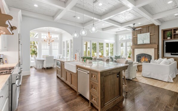 Inside, soaring ceilings and chic coastal décor set the tone for relaxation. The gourmet kitchen, decked out with high-end stainless-steel appliances, is ready for anything from pancake breakfasts to seafood delights. In the living room, a huge TV and direct pool access make it the ultimate hangout spot.