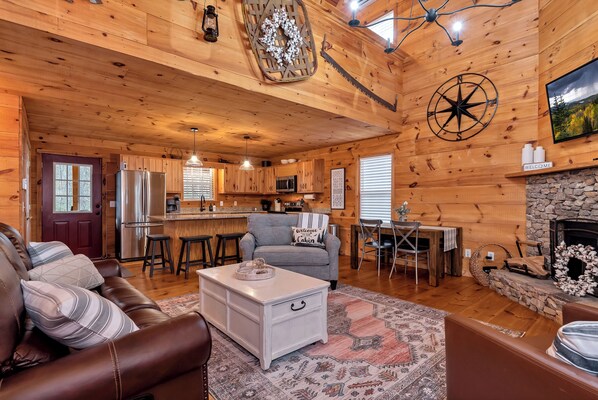 From the moment you step onto the property, you'll find everything you need for a relaxing mountain getaway. This cabin offers a private escape where you can kick back on the porch swing, gather around the fire pit, or simply enjoy the peaceful surroundings. A paved driveway provides ample parking, and inside, a spacious living room and kitchen welcome you with a cozy, inviting atmosphere. The kitchen is fully equipped with modern appliances, making it easy to prepare meals and create lasting memories.