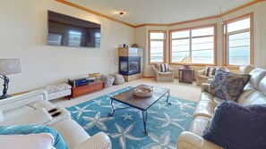 Across from Oregon's most popular surfing spot, EYE OF THE STORM is a spacious townhouse with luxurious living and panoramic white water ocean surf views. It offers 3300 square feet of living space on three levels, an open living room with plasma TV, gourmet chef’s kitchen and dining area as well as three separate decks for enjoying the view.