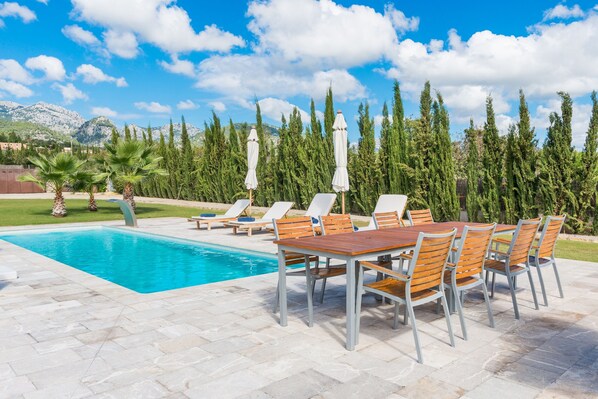 With outstanding panoramic views over the Tramuntana mountains and several nearby towns, the Villa Ses Rentadores is situated in a rural idyll just outside of Selva and can accommodate 8 people. Spread over 2 floors, the air-conditioned villa with sunlit rooms and modern, airy architecture has 4 bedrooms, 4 bathrooms (with Jacuzzi), an extra toilet, 2 living rooms and a well-equipped kitchen. The high-quality amenities include Wi-Fi, a high chair, a cot, an extra bed (for an additional fee) and a parking space. Small pets are welcome. The stand-out highlight is the outside area with its garden planted with Mediterranean flora, several balconies and terraces with a spectacular view of the surroundings, a 31-m² pool and barbecue. Ses Rentadores leaves nothing to be desired and offers you not only many amenities but also breakfast (for an extra charge). Shops, restaurants and bars in the small town of Selva are just a few minutes away by car and the bays of Pollença and Alcúdia with their fine sandy beaches are around 30 minutes away by car.