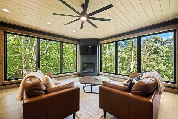 • Cozy living room with fireplace, plush leather sofas, + flat screen TV