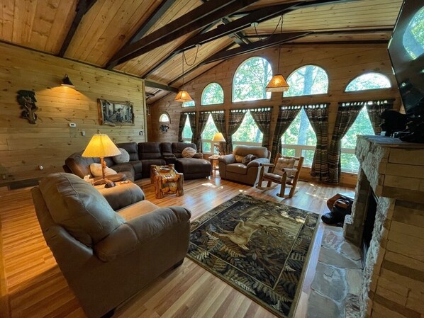 The main level has a beautiful L shaped custom fully stocked kitchen with 2 of every major appliance (with a ton of extra amenities provided for our guests)! It has top of the line appliances, 2 gas stoves, 2 microwaves, 2 dishwashers, and 2 refrigerators (one being on the screened in porch), with beautiful granite counter tops and a coffee bar with a lot of extras! On the main level you will also enjoy having a full size stacked washer and dryer (liquid laundry soap, Downy, & dryer sheets provided). The dining area has a very large 8 foot rectangle log dining table with 8 log dining chairs, a round cedar high top log table that seats 4, and 6 beautiful log stools at the 11 foot breakfast bar that has double granite counter tops. It's equipped with 3 propane fireplaces (in season), one in the large living room, one in the sitting room nestled off to itself on the main level, and 1 fireplace is downstairs. This main level also features a full nursery with a baby bed, changing table, sofa bed and a rocker. It has an offset office space in the back of the cabin past the dining room tables, with large windows so you can work at a beautiful log desk. This room also has 2 leather sitting chairs so you can enjoy your morning coffee and look out back at the beautiful outdoor surroundings. A baby high-chair is also there for the little ones. The main level has 2 full baths with walk-in showers. The main bath can be accessed from both hallways and has double copper sinks on a beautiful rustic barrel vanity and a walk-in shower. You have a large king bedroom with a bay window, a twin over twin bunk bedroom, and a queen bedroom with it's own on suite full bathroom, a 2 player 60 game barrel video arcade table, a nice sitting room with a couch and rocker swivel chair that also has a black stand alone propane fireplace (in season), and outside from this room is a large screened in area that has a high top card/game table that seats 6 people, for all of you card and game players.