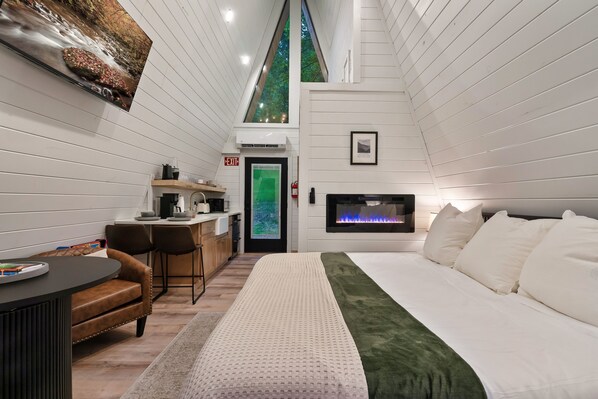 Enjoy this cozy A-Frame experience as a couple or small family. This is a studio sized structure with roughly 300 sq ft. We do provide a pack n play and air mattress if you chose to bring a small family (items accessed by a ladder and floor space will be tight). Between the pack-n-play and air mattress, there's room for 3-4 people depending on how many kids or babies you're bringing :)