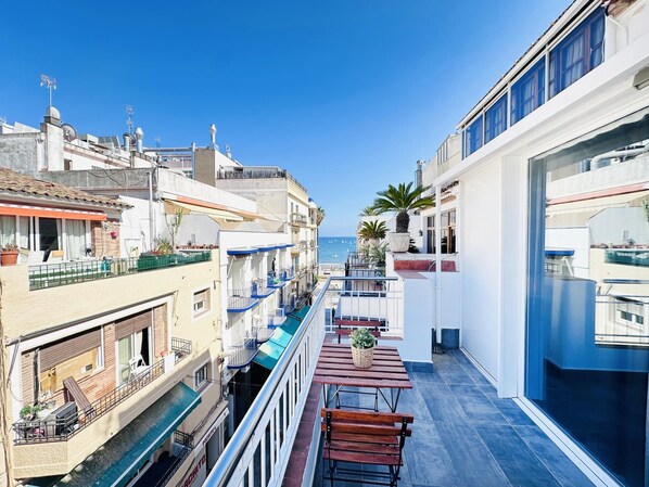 The highlight of the property is the terrace, facing the busy street below and offering partial sea views, so you can check the state of the waves and choose your spot on the sand from your home before jumping to the beach.