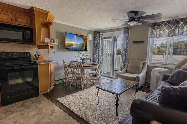 For your comfort, the bedroom suite provides you with a queen bed. The pullout sleeper sofa in the living room can accommodate up to two additional people. The bathroom is conveniently in the hall and has an updated bathroom vanity.
