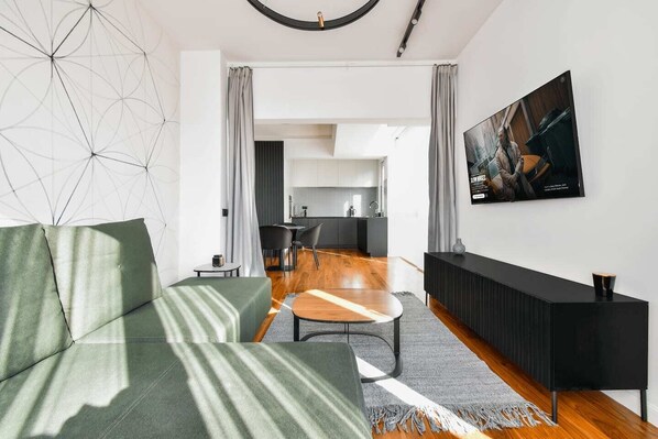 You’ll walk into a bright open-plan living area that combines a cozy lounge, dining space, and a fully equipped kitchen with everything you’ll need — from a coffee machine and oven to a dishwasher and sleek finishes.