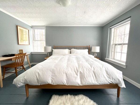 The bedrooms are all upstairs and include roller shades on all windows. The Primary bedroom has a beautiful antique queen bed, a desk with printer/scanner, large closet and its own bathroom with a large walk-in shower. The primary bathroom has one of the best views from the house! Another bathroom on that floor is shared by the three other bedrooms. The Blue Room is another large bedroom which features a king bed, a desk, dresser and a half bath with a walk-in closet. There are two more bedrooms on that floor, one with a queen bed, dresser and desk, the other one has a trundle bed, closets and antique chair.