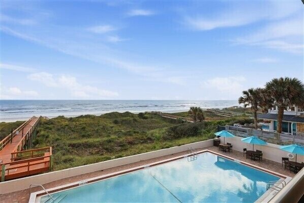 This 3rd floor balcony suite has a lovely view of the pool and ocean. The coastal gray hues in the living room and bedroom remind you of the seaside enjoyment that is just outside the sliding glass door. This condo has a queen sleeper sofa in the living room and comfortable chair which are perfect for enjoying the view of the ocean or the large flat screen smart TV. This condo's kitchen is fully equipped with a 4-burner flat top stove and oven. Drip coffeemaker with Folgers filter pack coffee is provided for your visit. The bathroom has an older tub but plenty of other modern updates. The modern bathroom sliding door has a narrower opening at 26”. For a great night's sleep, we turn to the bedroom where a firm King Size foam mattress awaits. Fall asleep while watching the flat screen TV. The bedroom has tinted windows so that you can enjoy a cooler visit and curtains so you can enjoy some privacy. This condo has everything you need to make your beach stay comfortable and affordable. Daily Housekeeping included (once per week on monthly stays). Close to the property's south end elevator and stairs. NO PETS ALLOWED Minimum age to rent is 21 years old