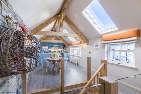 オープンプランのリビング/ダイニングルームは、美しいオーク材の梁と豪華な金具が自慢です。 設備の整ったキッチンは、家族のダイニングエリアにまで及びます。 無料のウェルカムパックがお楽しみいただけます。