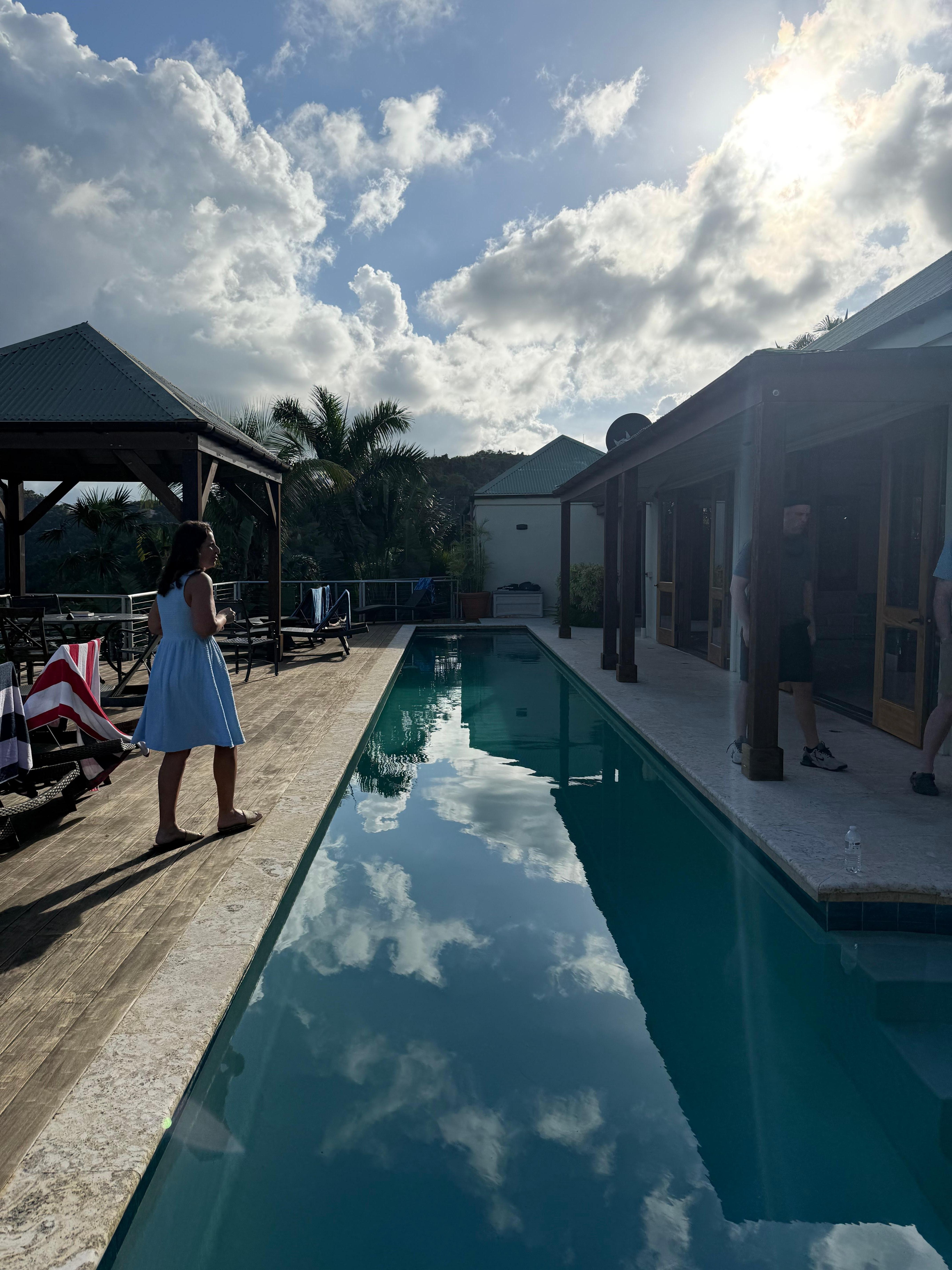 A 60 foot pool, surrounded by a 75 foot deck, a dining gazebo, abundant deck furniture, and stunning views provide a delightful daytime playground. At night the low voltage site lights, the breathtaking view, tranquil privacy and the fabled Caribbean moonlight all combine to produce an irresistibly romantic, peaceful, and relaxing evening setting.