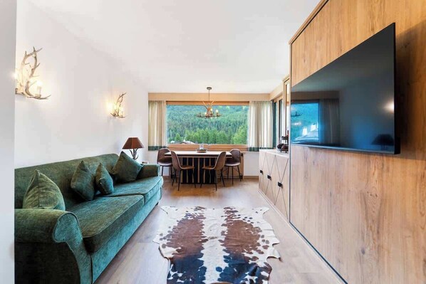 La zona giorno è luminosa e confortevole, arredata con elementi di design in legno su misura e dettagli in stile lodge, come applique e lampadari che richiamano la tradizione montana. Qui è presente anche un divano letto matrimoniale, ideale per ospitare fino a quattro persone senza rinunciare al comfort. Accanto al salotto si trova la zona pranzo, un angolo meraviglioso dove gustare un pasto o lavorare con lo sguardo rivolto verso il panorama. La sensazione di quiete e di apertura verso la natura è uno dei punti forti dell’alloggio.