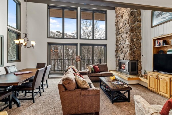 Enter the remodeled property on the main level and into the open living area which features floor-to-ceiling windows, incredible slope views and plenty of natural light. It also offers ample comfortable seating on the new sofa. Sit back and relax, gather with friends and family by the electric fireplace, warm up and take in the beautiful scenery and/or watch a game or movie on the big screen TV.
