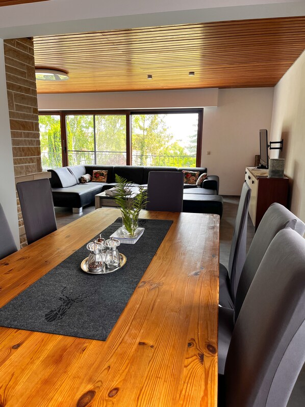 The holiday apartment with over 110 m² can accommodate 8 people. It has three bedrooms with a king- and queen-size double bed and two bunk beds, so it offers enough space for a large family or two families, for hikers, etc. The spacious living/dining area is completely open, you can eat, play or just play there "just" relax. The view from the panoramic window invites you to linger, the vastness of the hilly landscape is very impressive, especially in the morning. The adjoining kitchen is equipped and can of course be used completely. The bathroom has a large shower cubicle, the toilet is separate - both are equipped with towels and soap.