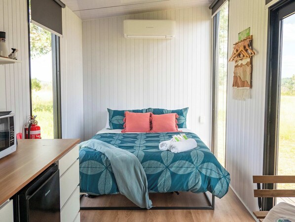 This cozy 139-square-foot tiny home features fresh, drinkable water sourced from an artisan underground bore. It includes a queen-sized bed, split air conditioning, a kitchenette with cooking equipment, and excellent bathroom facilities. These amenities include an eco-friendly cassette toilet, hand basin, and gas-heated shower.