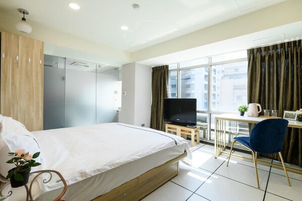 輕奢行政採光套房|獨立衛浴|德國Queen床・整面大窗採光|步行1分鐘到捷運