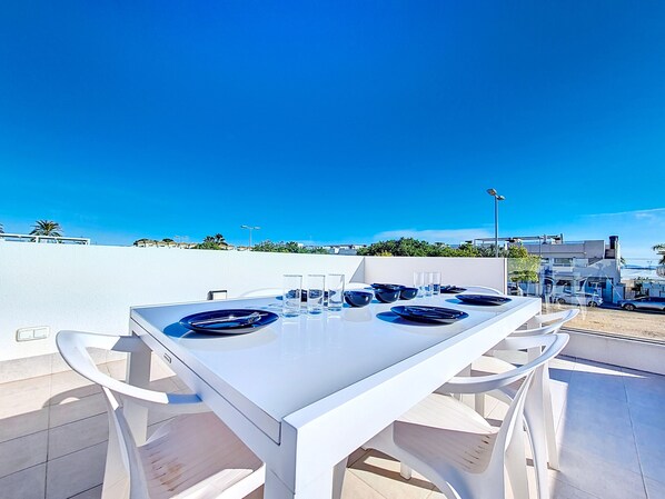 The large roof terrace, is the perfect place to relax it features a large dining aera, making it an excellent spot for al fresco meals or simply enjoying the views in a tranquil setting.