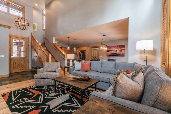 Each bedroom features comfortable king beds, premium linens, flat screen TVs, and modern fixtures. The three-bedroom Cottage includes a downstairs master suite with separate access to the back deck. While all bedrooms feature an ensuite bathroom, the master suite includes a double vanity, walk-in shower, and large soaking tub with jets. One of the two upstairs bedrooms also features a split king option, which allows for a twin bed configuration to better accommodate groups looking for additional space to sleep.