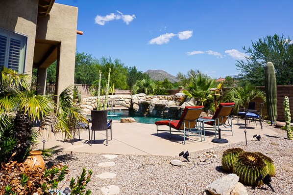 Beautiful, bright, and very inviting, this gorgeous Dove Mountain oasis - located just a little over 20 miles from the heart of Tucson - is ready to host you and your family or travel group for a truly memorable time! Boasting sunny, open spaces, comfortable furnishings, and high-end amenities, this home will take your breath away! Visiting chefs will fall in love with the incredible gourmet kitchen with deluxe, stainless steel appliances and a cozy breakfast nook for casual meals or family game nights. For more formal meals, gather in the elegant dining room with its impressive table for 12! Meet up for movie nights in the living area with plush velvet sofas and chairs and a wall-mounted flatscreen TV for streaming your favorite channels. You'll also find a home office here with a desk and chair all ready for remote work or schooling. And right outside, the fun really begins in your amazing back yard complete with a covered and furnished patio, flatscreen TV, gas grill, putting green, and refreshing, private pool with cascading waterfalls. It doesn't get any better than this!