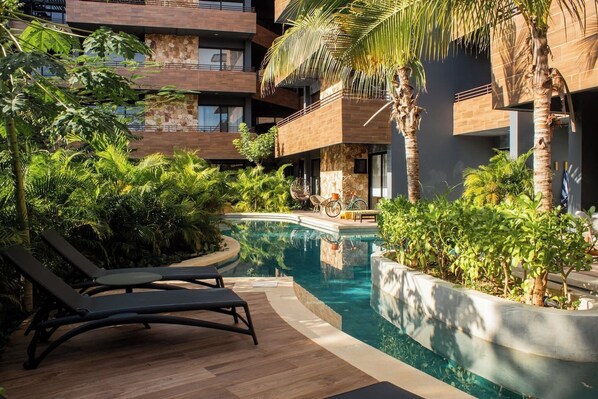 Tu balcón privado es donde todo sucede: primera llamada del día con pájaros de fondo, lectura de tarde con la brisa, copa de vino al caer la noche con estrellas de Tulum como techo. No es un balcón —es tu extensión del mundo.