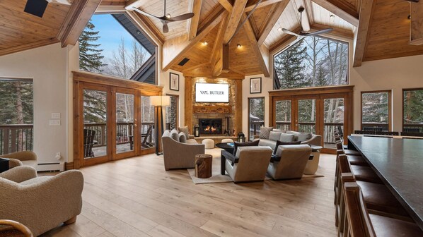 Beyond the living room, an expansive patio leads you to an untouched aspen grove, offering a tranquil retreat where the sounds of nature replace the bustle of everyday life. From the patio and the private hot tub, you'll enjoy serene views of the surrounding aspen glades, creating an idyllic setting for quiet reflection, outdoor dining, or simply basking in the beauty of Vail’s natural wonders.