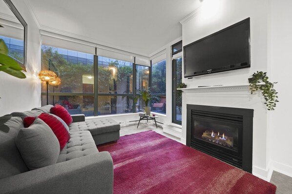 This stylish, condo features a large, private, wrap-around patio (with BBQ) surrounded by large hedges, giving you privacy and peace despite being right in the heart of the downtown action.
