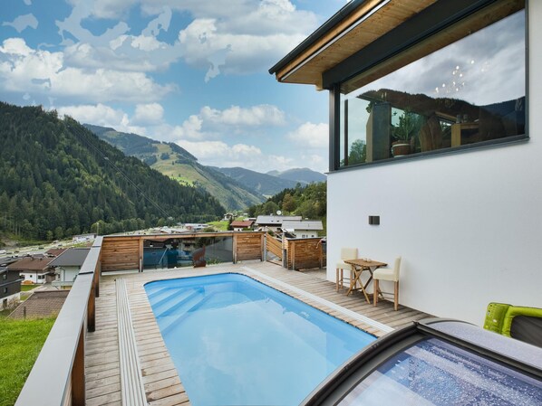 スキーサーカス・ザールバッハ=ヒンターグレム・レオガング・フィーバーブルンから歩いてすぐの距離にある屋外プール付きの山間のバケーションホーム