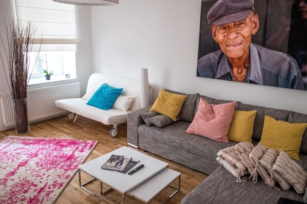 🛋 Spacious Living Room – Pull-out sofa, 50” flat-screen TV, media box & Bluetooth speakers.