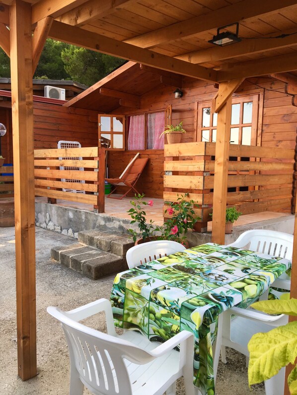 The chalet Baita Liverpool consists of bedroom with large window, double bed and 2 sofa beds, in another room there is the kitchen equipment, bathroom with shower, covered veranda with table and chairs and private garden. Parking space inside the Residence. The internal restaurant is available for excellent typical local menus with fresh fish delivered by the fisherman friend. In the morning we prepare cakes and typical pastries available for a breakfast to be consumed in the appropriate area of the internal Bar. The nearest beach, at 550 meters, is "Il Capricorno" botanical park houses native and exotic flora, along with an ancient citrus grove within a vast pine forest, there are areas with olive groves, whose centuries-old plants speak of the breath of this land of Puglia. The majestic and generous blades of prickly pear, with purple, orange or white fruits, very sweet and different in taste and aroma, are typical of the area. There are giant capers of the Gargano, with the most beautiful flowers of an orchid, very elegant, which open from the famous edible bud. The bright blue bellflowers, which cling everywhere and catch the eye, the datura from the large bell flowers, pink, yellow and white, with an intense oriental scent, and various species of jasmine, bougainvilleas with rare colors, agapant as fires, Jacaranda and Erytrina cristagalli trees, rare plants from Borneo, South America, Madagascar, Africa. The beautiful Baoinie with big fuchsia, red, white and bilobed leaves, the Choritie with barrel-shaped emerald trunks and big thorns, and beautiful pink and white flowers. The seven-hectare park is a refuge for any sedentary or walking bird species.
