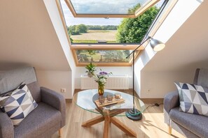 Modern, light-filled, non-smoking, two-room holiday apartment with contemporary furnishings for two people. This apartment features a separate bedroom, an open-plan kitchen with adjoining living area, a shower/WC, and a storage room. The panoramic window in the living area offers unobstructed views of the garden. All windows in this home have exterior blinds. A parking space and bicycle storage are available directly in front of the house. In the garden of Landhaus Rügeband, you can relax and enjoy the unobstructed views of nature. Our younger guests will find plenty to keep them entertained on our on-site playground. You can spend cozy evenings at the Waldschenke (forest tavern) with a barbecue.