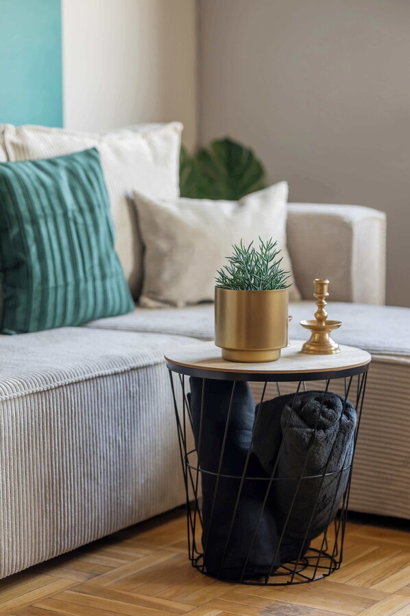This functional and thoughtfully arranged apartment of 47.5 m² is designed for up to four guests, providing ideal conditions for a weekend stay or a longer visit to the capital. The modern interior combines turquoise accents and bright whites with the warmth of natural wood, creating a cozy and harmonious atmosphere. The heart of the apartment is a bright living room with a kitchenette, perfect for relaxing after a day full of experiences. It features a comfortable double sofa bed and a large 50-inch Smart TV. The living room opens onto a spacious balcony with views of the surroundings, ideal for morning coffee or an evening drink.