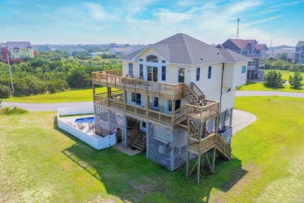 Drive up to the spacious grassy lot on a quiet street and find plenty of parking, some covered. It won’t be long before you settle into a lounge alongside the saltwater pool next to the house and begin that much needed vacation decompression. A six-person hot tub stands ready to further the cause. There’s a charcoal grill here, too, and two outdoor showers to accommodate a post-beach-day rinse off. Just inside on the ground level is a game room featuring a pool table, Smart TV, and a wet bar with a minifridge and sink. Feeling relaxed? Good.
