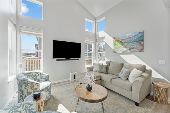 You will enter the property through the garage, and after leaving all your gear in the mud room, you will step into the open and bright great room, with many windows to flood this space with natural light. The living room is a showcase of contemporary design. Unwind on the comfortable sofa, which is also a full-size sleeper while enjoying entertainment on the Samsung 65” OLED Smart Tizen TV with 3 Sonos soundbars and Sonos subwoofer to create a great surround sound experience. Guests can also enjoy exciting games like Corn Hole and Axe Throwing game sets.