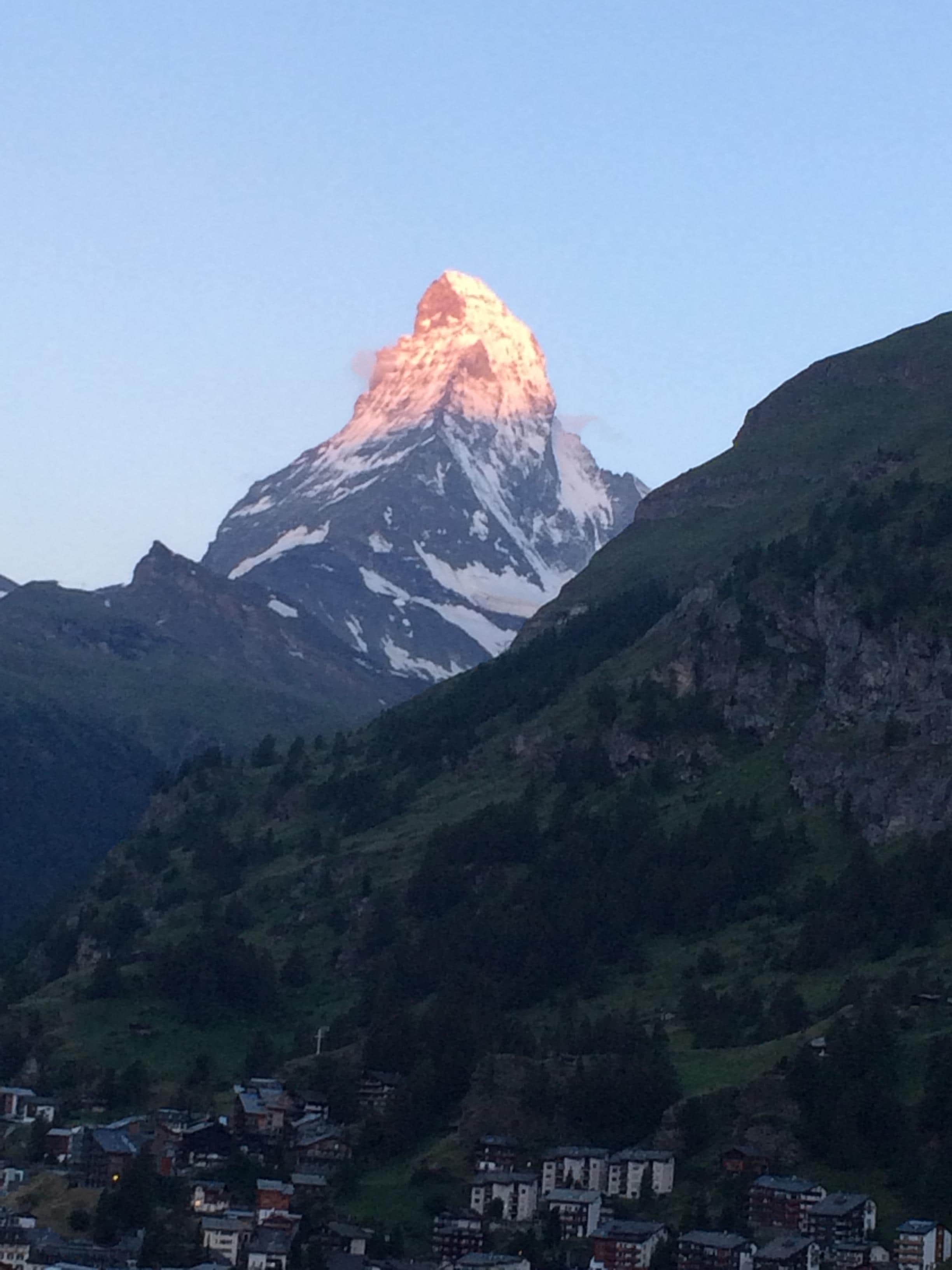 街の中心部からはちょっとあって、ホテルまでの坂はちょっときつい。そのおかげで、部屋からは常にマッターホルンが見えます。オーナーさんが気さくで、天気やその日のアクティビティに関するアドバイスをくれます。部屋は広くて快適。朝の天気が良ければ紅く燃えるマッターホルンを見ることができます。