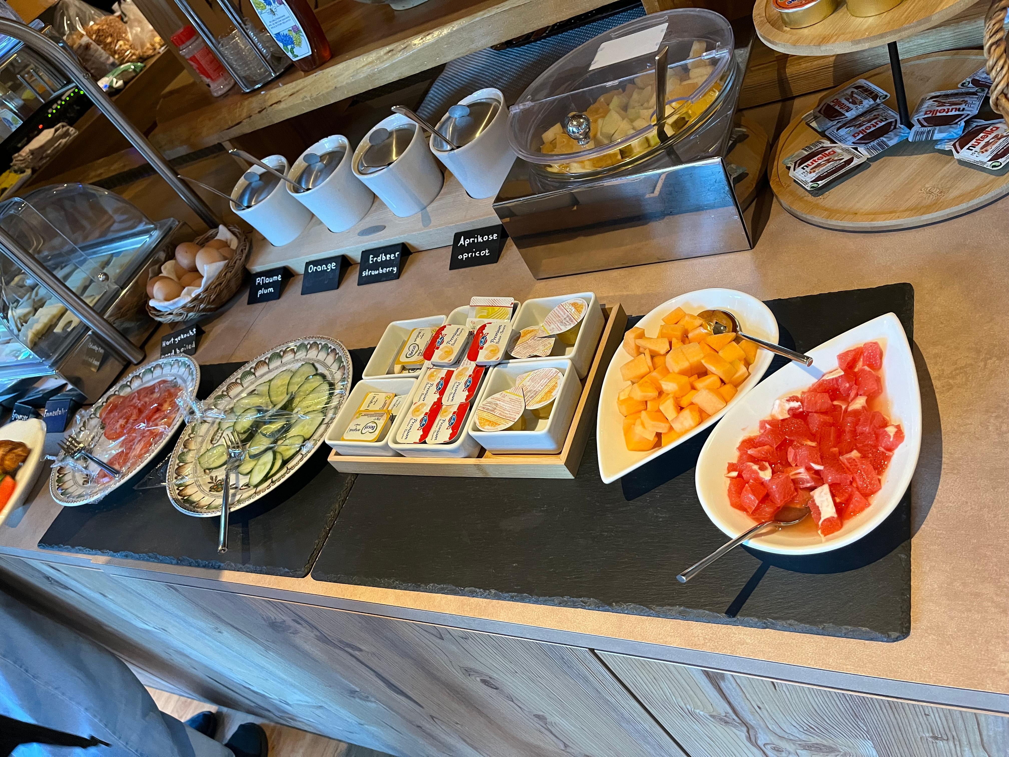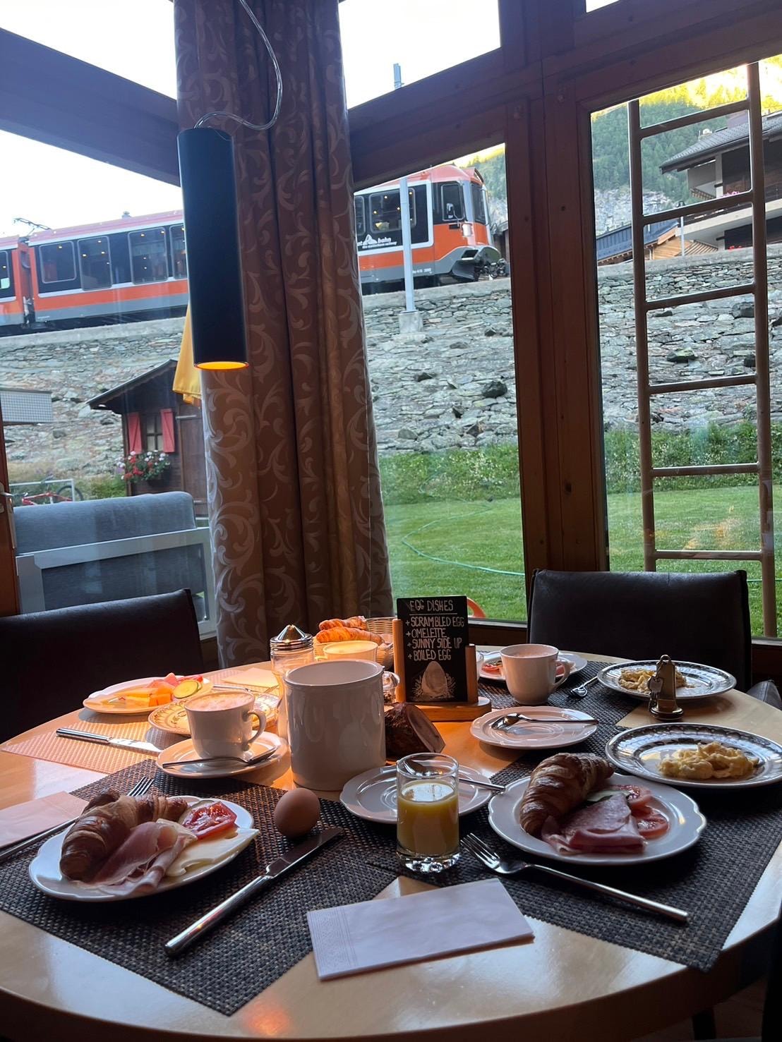 昼の12時過ぎに到着したが、すぐにチェックインできた。部屋は広くて明るく、バスタブもあり、とても快適だった。バルコニーからの眺めも、マッターホルンは見えないものの、遠くに山が見え悪くはなかった。朝食は7時半から。l