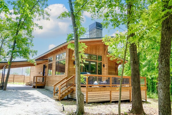 Nestled within the trees, The Highlander House offers a serene escape with room for nine. With a private wrap-around patio and hot tub, you can unwind in comfort just yards from the lake.